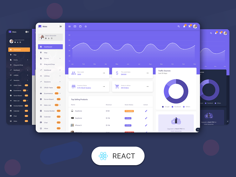 MatX is feature-packed with a simple codebase React Material Design Admin Dashboard template. MatX is built with React, Redux & Material UI. We implemented all the features you might need to start a new Web application. The free version includes all Material UI components, Form elements, and validation, JWT authentication, Sign in, sign up pages, Vertical navigation, Lazy loading, Code splitting, SASS integration.